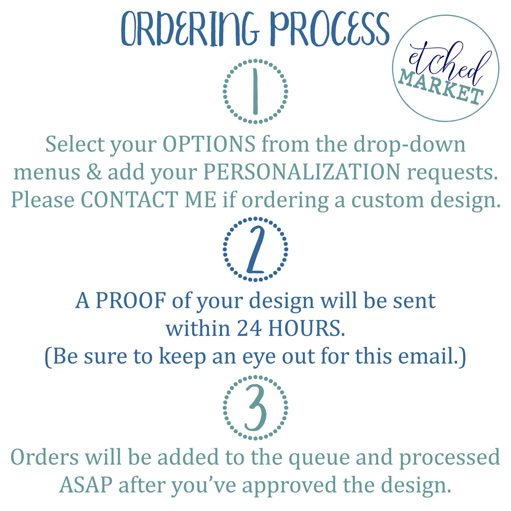 ** DESIGN PROOF ** If ordering a custom design, a proof of your design will be sent for approval prior to engraving your tumbler. The approximate processing time is 1-3 days after approval. Priority & standard shipping options are available.